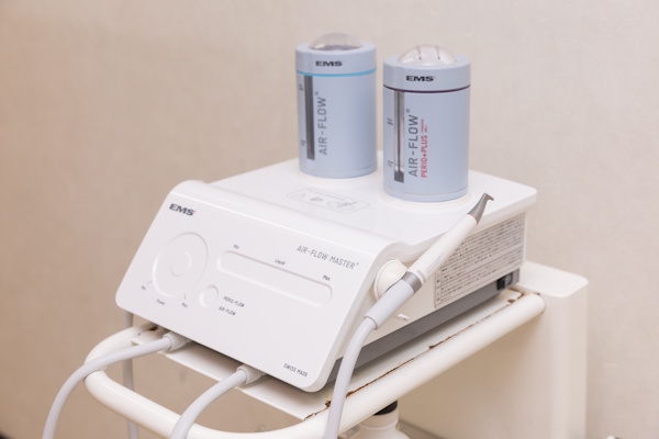 EMSエアフローは、スイスのEMS社が提唱する「ガイデッド・バイオフィルム・セラピー(GBT)」に基づいた最新の歯面清掃装置です。非常に細かなパウダー(エリスリトール)を温水と空気の力で吹き付け、汚れを効率的に除去します。