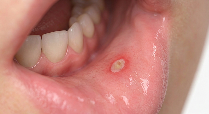 もっともよく見られる口腔粘膜疾患で、白っぽい潰瘍ができ、しみたり痛んだりします。