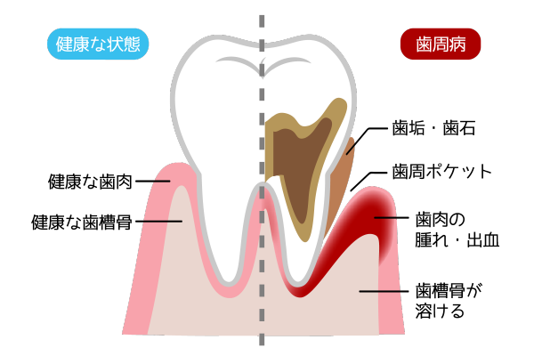 歯周病は、歯を支える歯ぐきや骨が炎症によって破壊されていく病気です。初期段階では自覚症状が少ないため気づかれにくく、気づいた時には重度に進行して歯を失ってしまうこともあります。成人の約8割が何らかの歯周病にかかっているといわれ、まさに「国民病」とも呼ばれています。